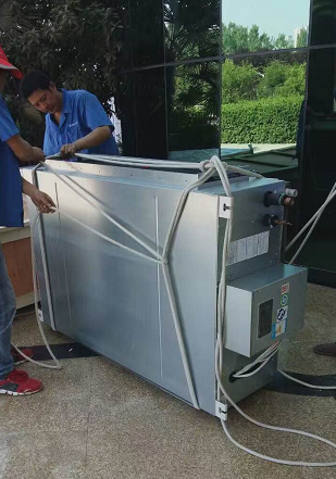 1、B系列风管机室内设备重达180公斤,需要四个工人才能将内机挂上去,为了施工安全,尚工从材料库拿来了麻绳,将内机进行了捆绑